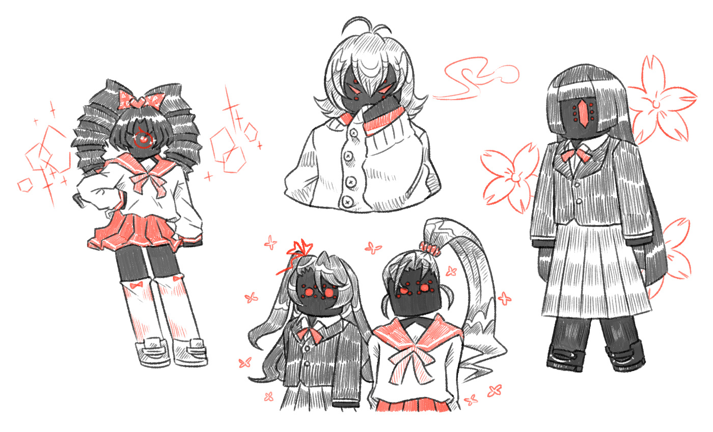 Compilation shot of the Happyville Slashers, unimplemented. Each character pictured is separated into their own pop-up screen. June 6th–7th, 2022.