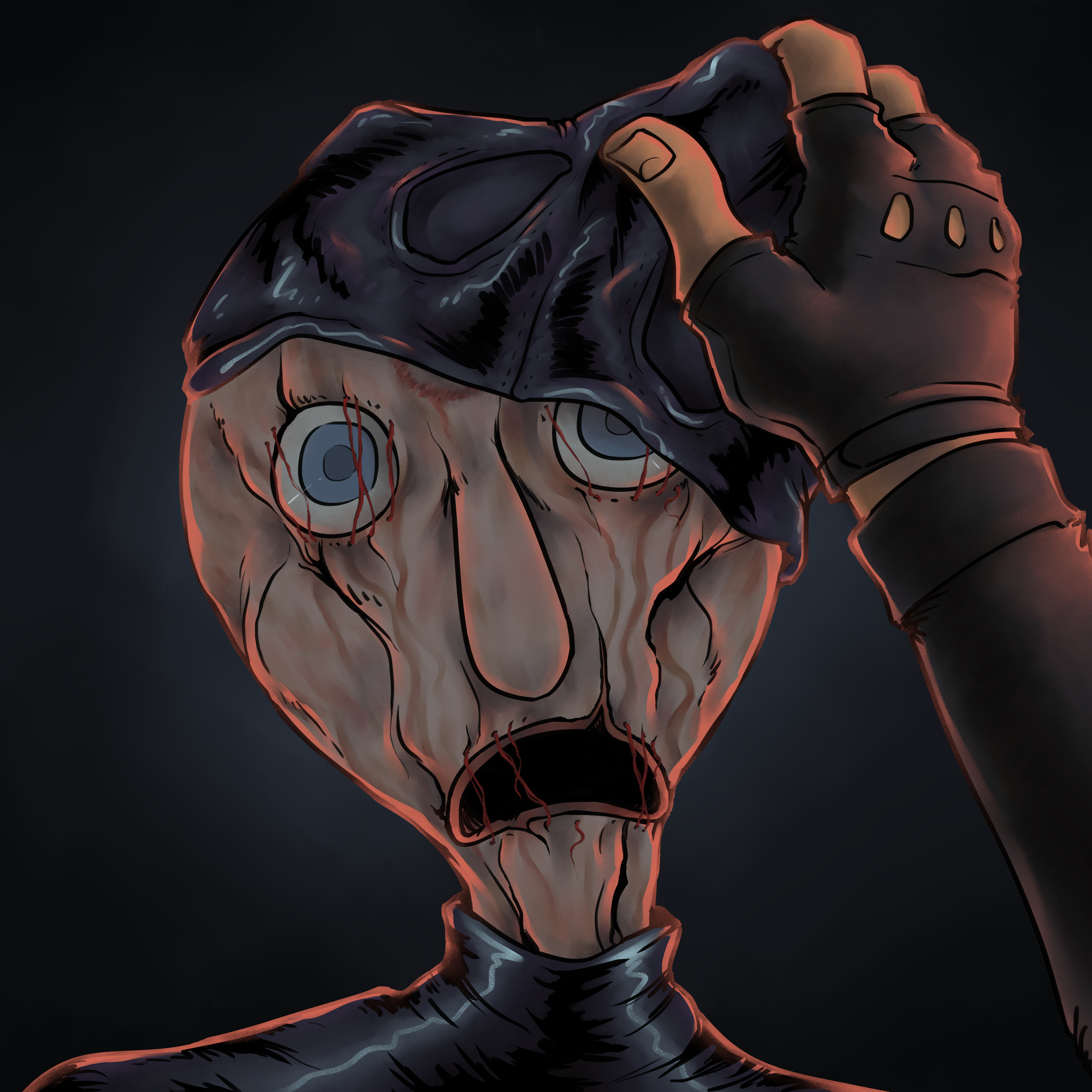 Selection from jumpscare screen for HIVE [game version 1.42.4]. One of three frames for a twitchy monologue sequence. April 24th, 2022.